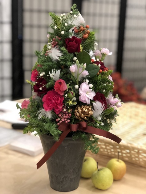 さて、先日みつわでもクリスマスをテーマにフラワーアレンジメント教室を開催いたしました。三角のオアシスをツリーに見立て、赤やピンクの花や松ぼっくり、羽を飾り付けしました。参加者の方には大変喜んでいただきました。