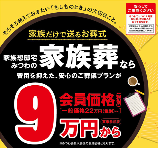家族想邸宅みつわの家族葬なら、費用を抑えた、安心のご葬儀プランが会員価格で9万円(税別)から。みつわ会員入会で費用を抑えて家族葬を執り行うことが可能です、「もしものとき」のためにも事前のご準備をお勧めしております。