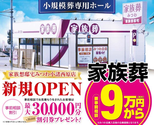 長野県小諸市丙に家族想邸宅みつわ 小諸西原店を新規オープンいたしました。OPEN記念キャンペーンなど実施しております、入会特典や事前相談割引などお得な特典が多数ございます。