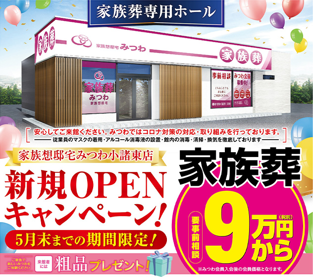 長野県小諸市加増に家族葬邸宅みつわ 小諸東店を新規オープンいたしました。新規OPENキャンペーンなど実施しております、入会特典や事前相談割引などお得な特典が多数ございます。