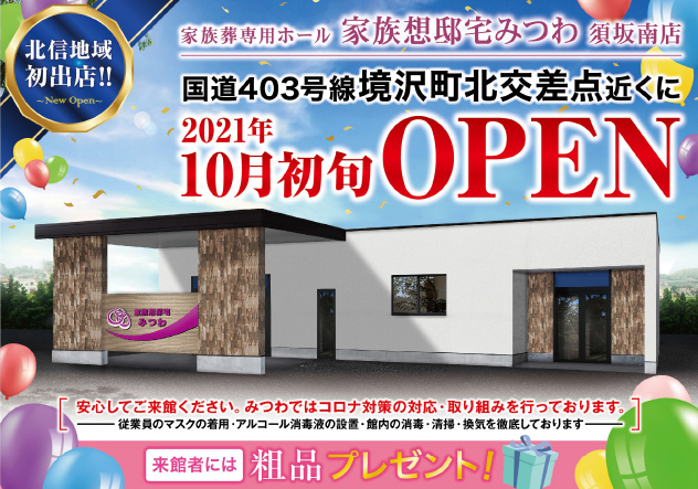 長野県須坂市墨坂南に家族葬邸宅みつわ 須坂南店を10月初旬に新規オープンいたします。新規OPENキャンペーンなど実施しておりますので、ぜひ式場を見にいらして下さい。