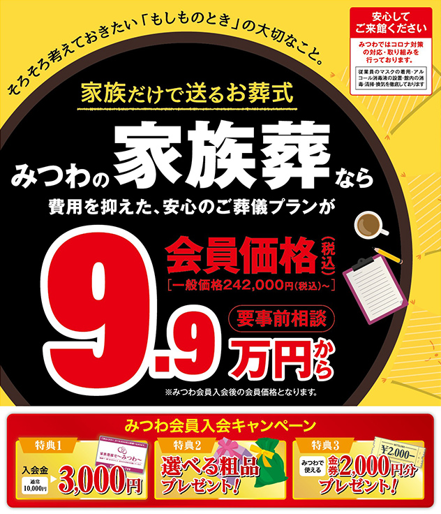 家族葬邸宅みつわの家族葬なら、費用を抑えた、安心のご葬儀プランが会員価格で9.9万円(税込)から。みつわ会員入会で費用を抑えて家族葬を執り行うことが可能です、「もしものとき」のためにも事前のご準備をお勧めしております。