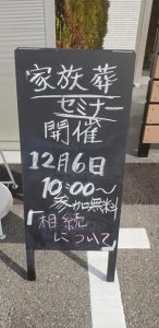 今回は、12月6日に行われた、家族葬セミナーについて書かせていただきます。当日、飛び込みの方もいたりとたくさんの皆様に ご参加いただきありがとうございました。
